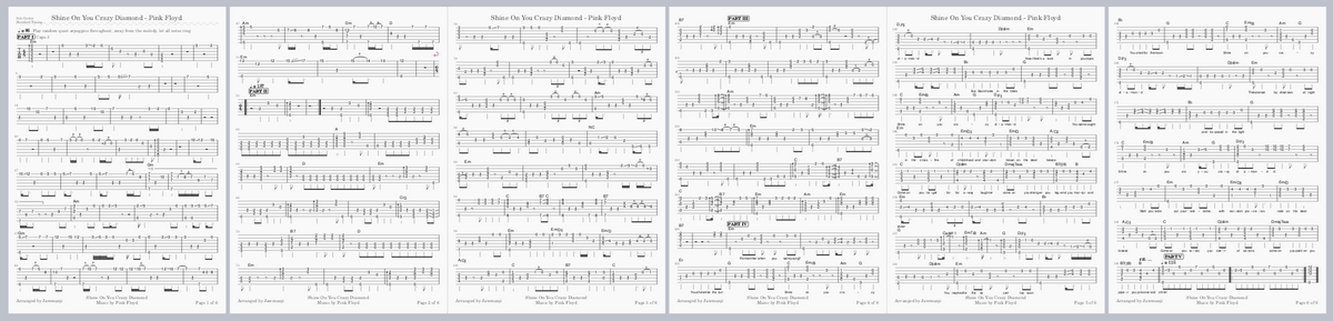 I saw Yoni play Shine On You Crazy Diamond many years ago, thought it was such a good interpretation, Ioved the idea of trying it, decided it was too much of an undertaking. Around May last year I had started noodling with it and even recorded a youtube short playing part I. Well I have been plugging away at it in the background. Yep, it is a massive undertaking. Heavily influenced by Yoni, there are a few bits he had taken out and I added in, a few bits he played I didn't. I also gave up at the start of part V whereas he took it a little bit further. I play my arpeggios different, more classical like maybe? I pay it different enough to warrant my own tab for it, otherwise in a years time I will have completely forgotten how to play it.